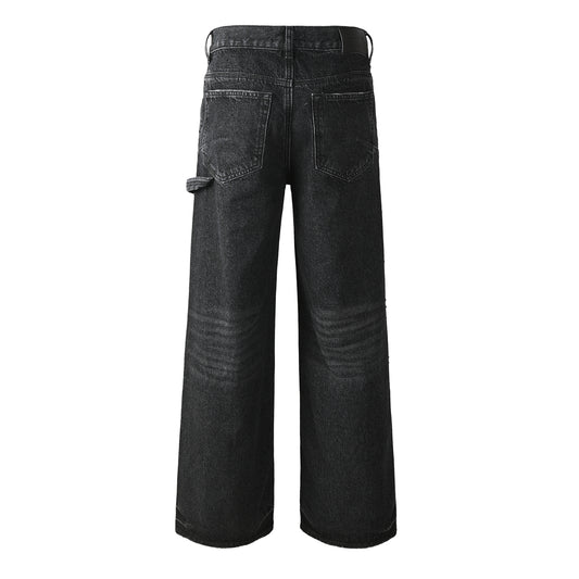 Men's Wide Leg Black Denim Jeans with Studded Front Panels and Streetwear Workwear Inspired Design 104