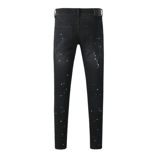 Streetwear Men’s Black Ripped Slim Jeans with Multi Color Paint Splatter Effect and Rugged Tear Details 9121