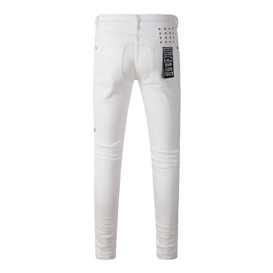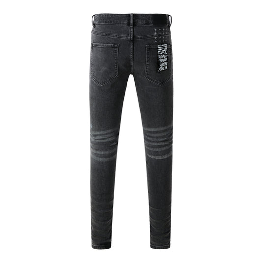 Men Streetwear Jeans Light Blue Washed with Cross Stitch Detail and Graphic Back Pocket Patch 3042