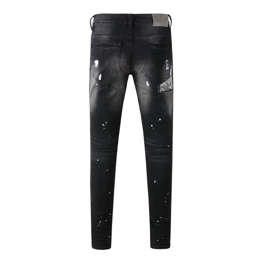 Men Streetwear Jeans Distressed Black Paint Splash Patch Ripped Skinny 9099