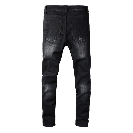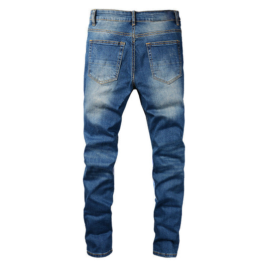 6666 High Street Ripped Patch Jeans Retro Men's Elastic Slim High Street Denim