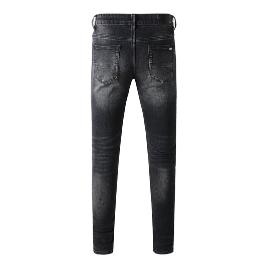 Men's Slim Fit Black Jeans with Street Style Patches, Vintage Wash, and Ripped Details 6848