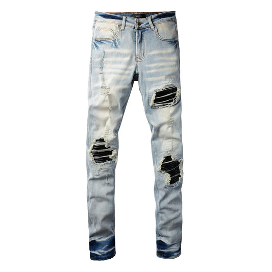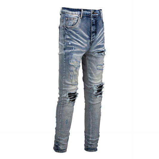 Men Streetwear Jeans Distressed Light Blue Patch Leopard Ripped Skinny 9095