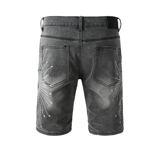 Men’s Gray Washed Denim Shorts with Shiny Studded Sunburst Pattern Streetwear Fashion Style 5093